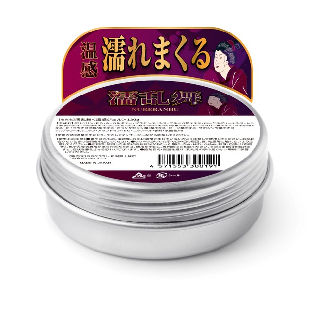 商品名 濡乱舞 名称 ボディ用温感ジェル 原材料名 グリセリン・PG・水・カルボマー・プラセンタエキス・アルニカ花エキス・ローヤルゼリーエキス・ レモン果実エキス・スギナエキス・ホップ花エキス・セイヨウアカマツ球果エキス・ローズマリー葉エキス・ ゴボウ根エキス・セイヨウキズタ葉/茎エキス・オランダガラシ葉/茎エキス・セージ葉エキス・サボンソウ葉エキス・ アルブチン・オルニチン・アラントイン・BG・エタノール・香料・水酸化Na 内容量 130g ご使用方法 適量を手のひらにとり、やさしく肌に馴染ませてください。 使用上の注意 ●非常に滑りやすいので取り扱いにはご注意ください。 ●目や耳などに付着しないようにご注意ください。 ●お肌に異常が生じていないかよく注意してご使用ください。お肌に合わないときはご使用をおやめください。 ●使用中または使用後に異常があらわれたときは使用を中止し、皮膚科専門医等へのご相談をおすすめします。そのまま使用を続けますと、症状を悪化させることがあります。 1)使用中、赤み、はれ、かゆみ、刺激、色抜け(白斑等)や黒ずみ等の異常があらわれた場合 2)使用したお肌に、直射日光があたって上記のような異常があらわれた場合●傷やはれ物、湿疹等、異常のある部位にはお使いにならないでください。 ●極端に高温、多湿、低温の場所、また直射日光の当たる場所に保管しないでください。 ●乳幼児の手の届くところに保管しないでください。