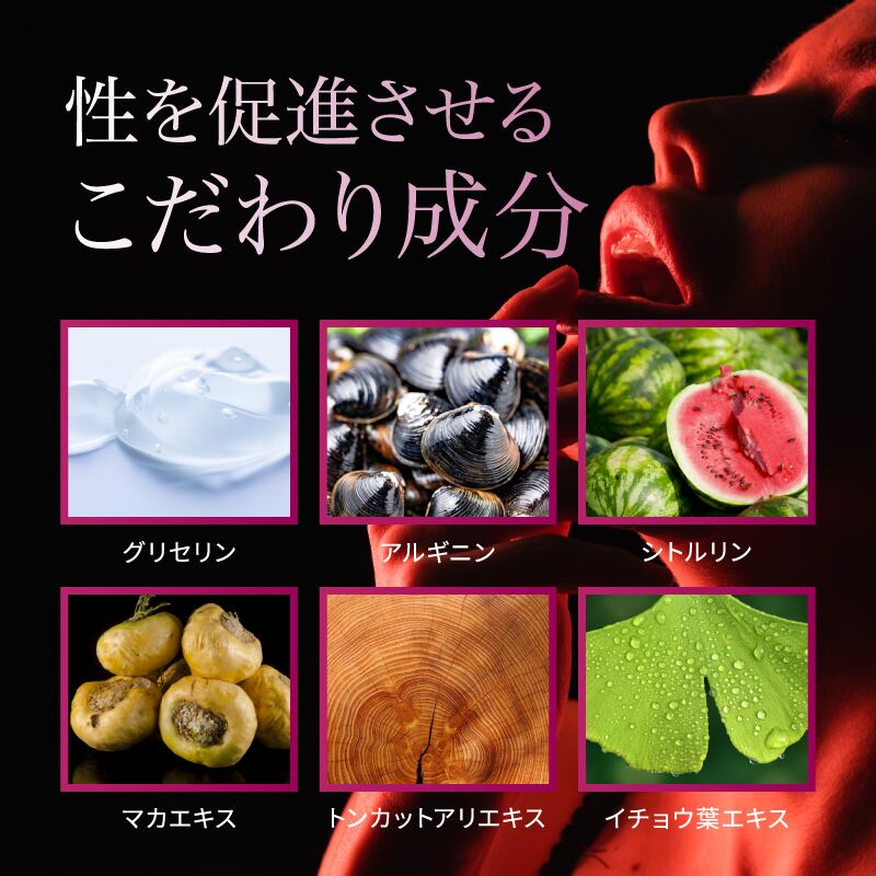 原材料名 グリセリン、マカ抽出物、トンカットアリエキス、シトルリン、アルギニン、プラセンタエキス、イチョウ葉エキス、 ポリアクリル酸Na、精製水、BG、DPG、エタノール、プロピルパラベン、メチルパラベン、エチルパラベン、香料
